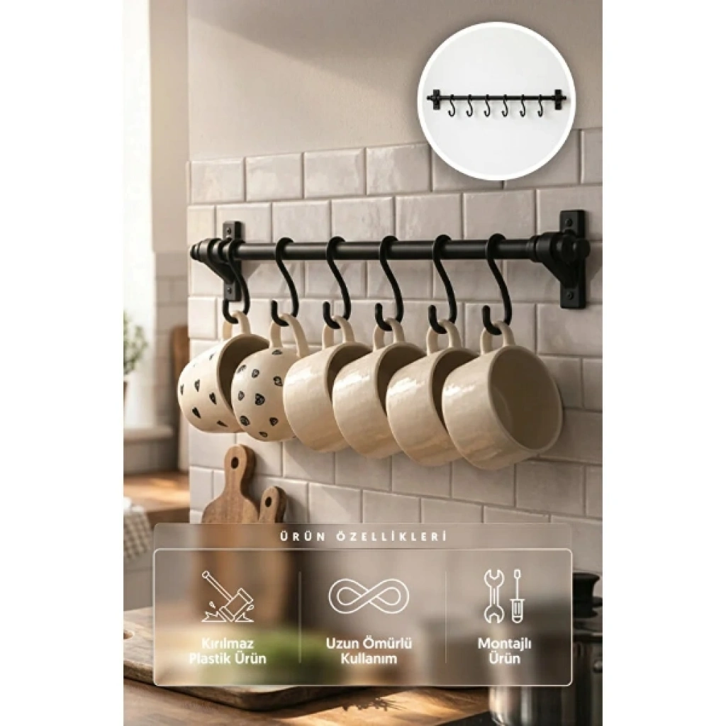8 KANCALI YAPIŞKANLI ASKI APARATI Ürün ÖzellikleriMutfak ve banyolarınızda düzeni sağlamanın en zahmetsiz yoluyla tanışın! 8 Kancalı Yapışkanlı Askı Aparatı, vidasız ve delmeden montaj teknolojisi sayesinde duvarlarınıza, fayanslarınıza zarar vermeden saniyeler içinde kurulum imkanı sunar. 55 cm genişliğindeki gövdesi üzerinde yer alan 8 adet dayanıklı kanca; kupa bardaklarınızı, mutfak gereçlerinizi veya banyo aksesuarlarınızı düzenlemek için geniş bir alan sağlar. 5 kg taşıma kapasitesi ile güçlendirilmiş yapışkan yüzeyi, kayma yapmadan sağlam bir tutuş sergiler. Kaliteli ve dayanıklı malzemesi sayesinde uzun ömürlü kullanım vaat eden bu askı aparatı, şık siyah tasarımıyla modern dekorasyonunuza estetik bir dokunuş katar. Matkap derdi olmadan evinizi organize etmek isteyenler için hem pratik hem de sağlam bir çözümdür.Ürün Teknik ÖzellikleriÖzellikAçıklamaGenişlik55 cmKanca Sayısı8 Adet Hareketli/Sabit KancaTaşıma KapasitesiMaksimum 5.0 KGMontaj TipiVidasız, Güçlü Yapışkan Teknoloji (Delme Gerektirmez)MalzemeDayanıklı ve Kaliteli Malzeme YapısıRenkModern SiyahKullanım AlanıMutfak (Bardak/Gereç), Banyo (Havlu/Lif), AntrePaket İçeriği1 Adet 55 cm Askı Borusu 8 Adet Kanca Güçlü Yapışkanlı Montaj Aparatları.