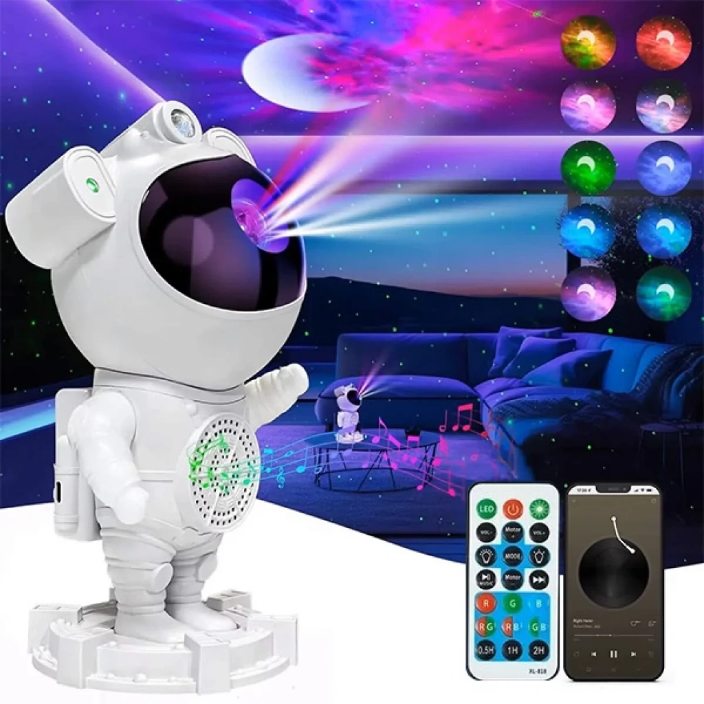Kutusundan çıkan uzaktan kumanda ile ışık gösterisinin tadını daha rahat çıkarabilirsiniz. Sadece arkanıza yaslanın ve tek bir düğmeyle istediğiniz görüntü efektini seçin. Ayrıca projektör, astronotun arkasındaki düğmelerle kontrol edilebilir.