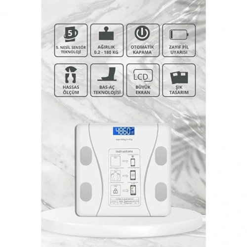 BEYAZ RENK BLUETOOTH ÖZELLİKLİ AKILLI TARTIÜrün ÖzellikleriModern yaşamın vazgeçilmez sağlık yardımcısı olan Beyaz Renk Bluetooth Özellikli Akıllı Tartı, yalnızca kilonuzu değil, aynı zamanda vücut kompozisyonunuzu da detaylı şekilde analiz eder. Gelişmiş sensör teknolojisiyle donatılan bu akıllı tartı, vücut yağı, su oranı, kas kütlesi, kemik kütlesi, protein oranı, visseral yağ, BMI (Vücut Kitle İndeksi) ve BMR (Bazal Metabolizma Hızı) gibi verileri yüksek hassasiyetle ölçer.Bluetooth bağlantısı sayesinde akıllı telefon uygulamasıyla kolayca eşleşir ve ölçüm sonuçlarını anlık olarak kaydeder. Böylece zaman içerisindeki vücut değişimlerinizi takip etmenize imkân tanır. LCD ekranı, ölçüm sonuçlarını net bir şekilde gösterirken, otomatik kapanma özelliği pil ömrünü uzatır ve enerji tasarrufu sağlar. Maksimum 180 kg kapasiteye sahip dayanıklı yapısı, uzun ömürlü kullanım sunar.Şık, sade ve modern tasarımı ile her banyo, spor salonu ya da sağlık merkezine estetik bir dokunuş katar. Hem günlük kullanım hem de profesyonel fitness takibi için mükemmel bir yardımcıdır.Paket İçeriği1 adet Beyaz Renk Bluetooth Özellikli Akıllı Tartı