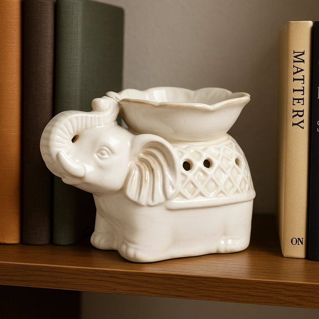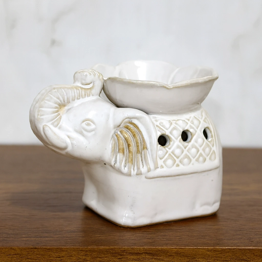 BEYAZ SERAMİK FİLLİ BUHURDANLIKÜrün ÖzellikleriBeyaz Seramik Filli Buhurdanlık, evinizde hem dekoratif hem de aromaterapik bir atmosfer oluşturan zarif bir tasarımdır. 14x10 cm ölçülerindeki bu özel buhurdanlık, detaylı fil figürü ile estetik bir görünüm sunarken seramik yapısı sayesinde ısıya dayanıklı ve uzun ömürlü kullanım sağlar. Üst haznesine ekleyeceğiniz uçucu yağlar, esanslar veya aromaterapi karışımları ile bulunduğunuz ortamda rahatlatıcı bir koku yayılmasına yardımcı olur. Mumla çalıştığı için kablosuz ve pratik kullanım sunar, ortam dekoruna şık bir dokunuş katar.Meditasyon, yoga, uyku öncesi rahatlama veya günlük atmosferi yumuşatma gibi birçok kullanım alanına sahiptir. Hem kendi kullanımlarınız için hem de sevdiklerinize hediye olarak tercih edebileceğiniz dekoratif ve fonksiyonel bir üründür.Paket İçeriği1 adet beyaz seramik filli buhurdanlık