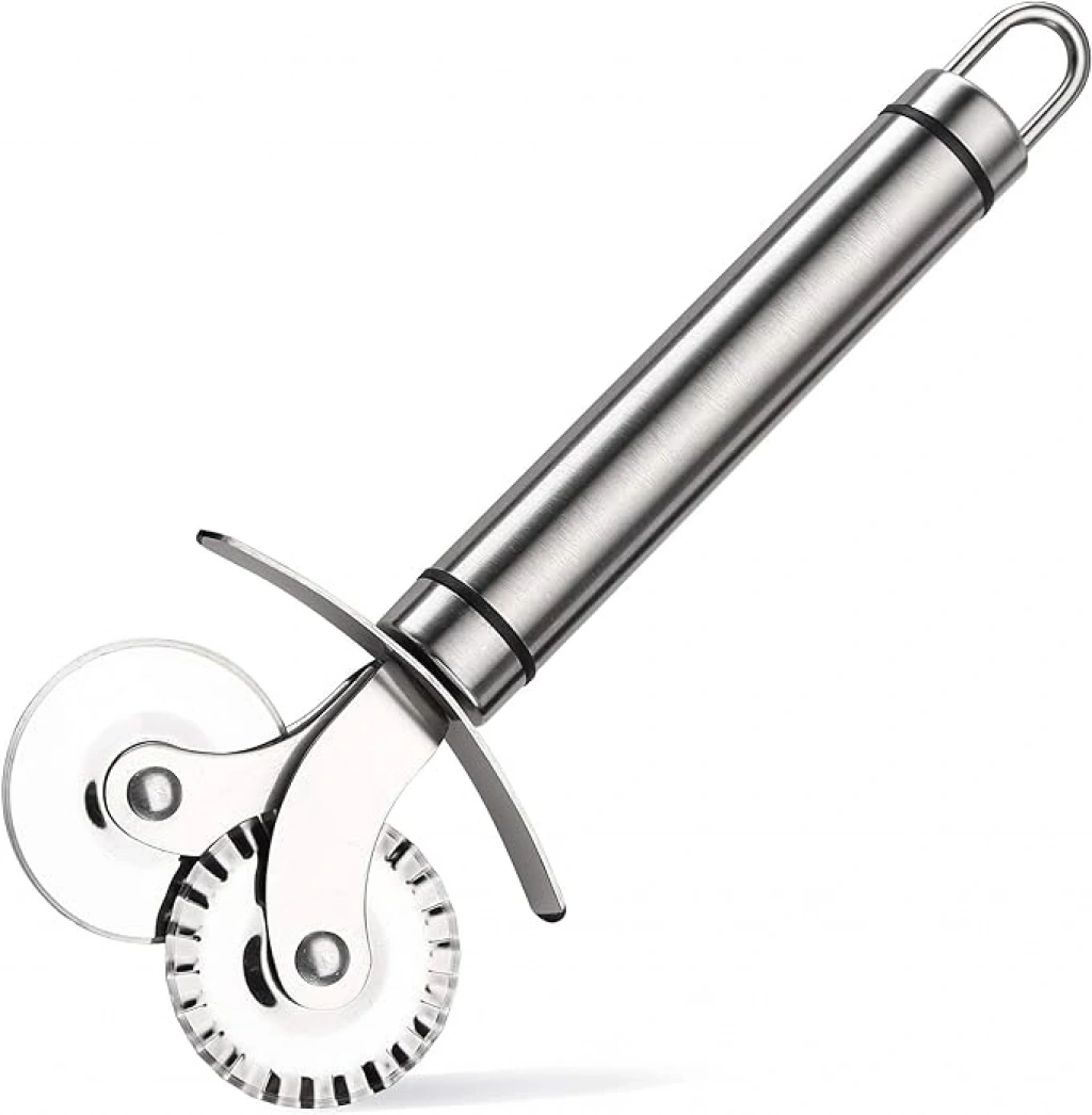 Çift başlıklı pizza ve hamur bıçağı, mutfakta pratik kesim sağlayan özel bir tasarıma sahiptir.