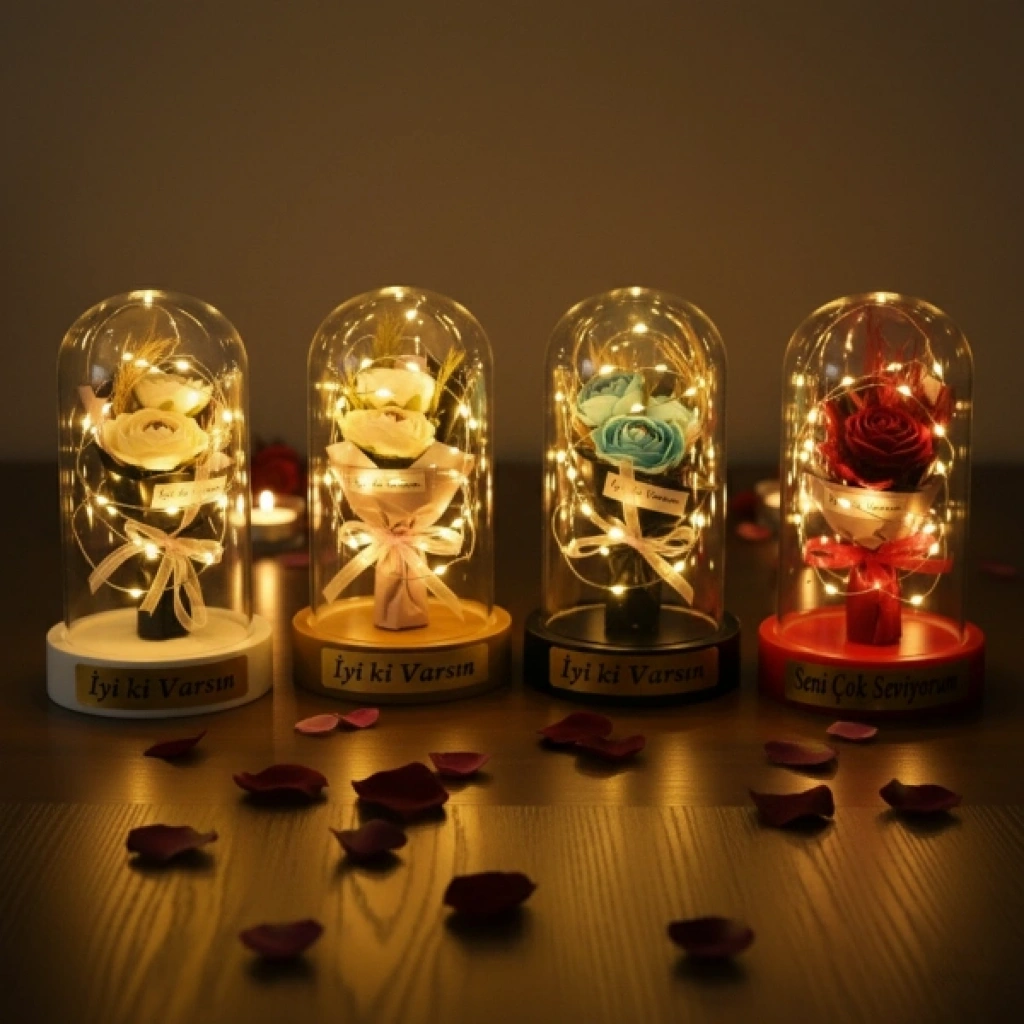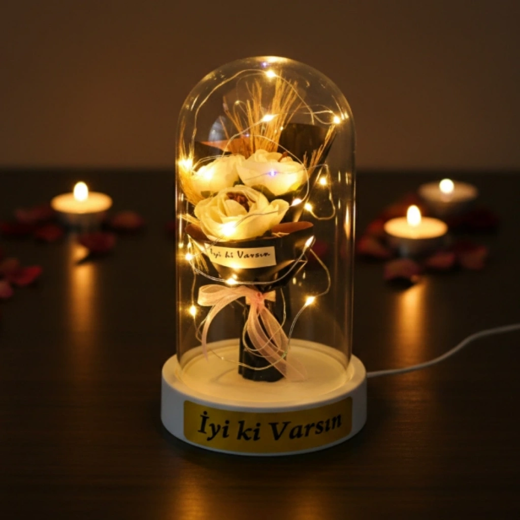 GÜL BUKETİ LEDLİ FANUSÜrün ÖzellikleriGül buketi ledli fanus, zarif tasarımı ve romantik duruşuyla yaşam alanlarına sıcak ve estetik bir ambiyans kazandıran dekoratif bir üründür. Şeffaf fanus içerisinde yer alan üç güllü buket tasarımı, bütüncül ve şık bir görünüm sunarak ürünü klasik fanus modellerinden ayırır. Sahip olduğu gün ışığı LED aydınlatma, yumuşak ve göz yormayan ışık yapısıyla masa, komodin ve raf üzerinde huzurlu bir atmosfer oluşturur. LED ışıkların fanus içerisinde dengeli şekilde yayılması, ürünü hem gündüz dekoru hem de akşam saatlerinde etkileyici bir gece aksesuarı haline getirir. Kompakt ölçüsü sayesinde yer kaplamadan kullanılabilen bu model, sevgililer günü, doğum günü ve yıl dönümü gibi özel anlarda romantik hediyelik fanus arayanlar için ideal bir tercihtir. Model seçimi yapılamayan ürün, görsellerde yer alan tasarımlardan biri olacak şekilde karışık model gönderimi yapılmaktadır.Ürün Teknik Özellikleri Özellik Açıklama Ürün Adı Gül Buketi Ledli Fanus Boyut 10 x 18 cm Aydınlatma Gün ışığı LED Tasarım Şeffaf fanus, üç güllü buket Model Karışık gönderilir Kullanım Alanı Masa, komodin, raf Kullanım Amacı Dekoratif ve hediyelik Paket İçeriği1 adet üç güllü gül buketi ledli fanus
