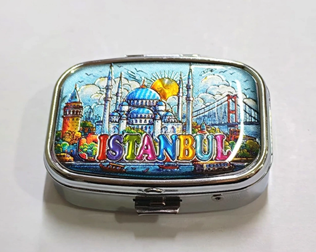 İSTANBUL TEMALI İLAÇ KUTUSU MODEL 4Ürün Özellikleriİstanbul temalı ilaç kutusu, canlı ve detaylı tasarımıyla günlük kullanımda hem işlevsel hem de estetik bir sağlık aksesuarı sunar. Üzerinde yer alan İstanbul teması sayesinde koleksiyonluk ve hediyelik eşya olarak da tercih edilen bu ürün, kompakt yapısı ile çanta içinde rahatlıkla taşınabilir. İç kısmında bulunan iki bölmeli ilaç kutusu tasarımı, farklı ilaçların düzenli ve karışmadan saklanmasına yardımcı olur. Dayanıklı gövdesi ve kapaklı yapısıyla ilaçların güvenli şekilde muhafaza edilmesini sağlayan bölmeli ilaç saklama kutusu, günlük kullanımın yanı sıra seyahatlerde de pratik bir çözüm sunar.Ürün Teknik Özellikleri Özellik Açıklama Ürün Adı İstanbul Temalı İlaç Kutusu Model 4 Ölçü Yaklaşık 5 x 5 cm Bölme Sayısı 2 bölmeli Tasarım İstanbul temalı kapak Kullanım Alanı Günlük kullanım, seyahat, çanta içi Paket İçeriği1 adet İstanbul Temalı İlaç Kutusu - Model 4