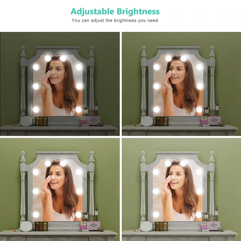 DC 12V çıkış voltajı, kullanımı güvenlidir. 10 adet G5 modern küresel ampul.Yapışabilir ışık pürüzsüz yüzey doğrudan veya kullanım vidaları (dahil değildir) işığı düzeltmek için. Her bir ampulün altındaki bir tel yuvasında yerleşik olarak, yedek kabloyu içine koymanıza izin verir, maks. Her lamba arasındaki mesafe 25.5cm, ampul tel uzunluğunu ihtiyacınıza göre ayarlayın.Yenilik dokunmatik kontrol anahtarı ve kademesiz dimmer. Göz kamaştırıcı değil, kademesi kısılabilir, uzun dokunmatik dimmer ile parlaklığı 20% ila 100% arasında ayarlayın.Karartma hafıza fonksiyonuna sahiptir.Paket İçeriği1 adet makyaj aynası aydınlatma kiti ( 10 adet ampul)
