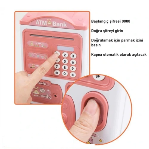 ChatGPT:PARMAK İZİ VE ŞİFRELİ ELEKTRONİK ATM KUMBARAÜrün ÖzellikleriParmak izi ve şifreli elektronik ATM kumbara, çocuklara tasarruf bilincini eğlenceli bir şekilde kazandırmak için tasarlanmış yenilikçi bir üründür. 20 cm yüksekliğinde, 13.5 cm genişliğinde ve 11.5 cm derinliğinde kompakt yapısıyla masa, raf veya komodin üzerinde kolayca kullanılabilir. Şifreli giriş sistemi ve parmak izi doğrulama özelliğiyle güvenli bir şekilde açılır. Başlangıç şifresi “0000” olarak ayarlanmıştır, kullanıcı dilediğinde yeni bir şifre belirleyebilir. Para ve madeni bozukluklar için ayrı giriş yuvaları bulunur; kağıt para girişine yaklaştırıldığında otomatik olarak içeri çekilir. Renk seçimi yapılamaz, görsellerdeki renklerden karışık olarak gönderilmektedir. Dayanıklı plastik gövdesi uzun süreli kullanım sağlar ve çocuklar için güvenlidir.Paket İçeriği1 adet Parmak İzi ve Şifreli Elektronik ATM Kumbara1 adet parmak izi ve şifreli elektronik ATM kumbara