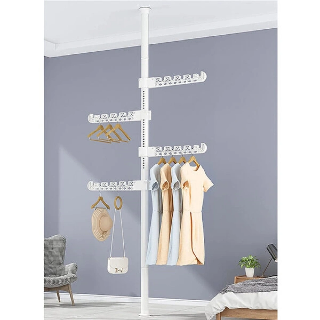 TELESKOPİK GİYSİ VE ÇAMAŞIR ASKISIÜrün ÖzellikleriTeleskopik Giysi ve Çamaşır Askısı, dar alanlarda maksimum verim almak ve kıyafetlerinizi düzenlemek için tasarlanmış yenilikçi bir depolama çözümüdür. Matkap veya vida gerektirmeyen, tavan ve taban arasına sıkıştırma yöntemiyle kurulan teleskopik direk mekanizması sayesinde evinizin her köşesini saniyeler içinde şık bir gardıroba dönüştürebilirsiniz. Ürün, üzerinde 360 derece dönebilen ve yüksekliği ayarlanabilen çok fonksiyonlu askı kollarından oluşur. Her bir askı kolu, 90 derece katlanabilir özelliği sayesinde kullanımda değilken yukarı doğru kapatılarak alan tasarrufu sağlar. Dayanıklı metal gövdesi ve yüksek taşıma kapasiteli özel askı yuvaları, kıyafetlerin birbirine karışmasını engellerken düzenli bir görünüm sunar. Sadece giysiler için değil; çanta, şapka ve aksesuarlar için de ideal bir askı alanıdır. Balkonlarda çamaşır kurutmak, yatak odalarında açık gardırop sistemi kurmak veya antrelerde vestiyer olarak kullanmak için mükemmeldir. Modern beyaz tasarımıyla her türlü iç mekan dekorasyonuna uyum sağlayan bu portatif askılık, taşınabilir yapısıyla kiracılar ve yer sıkıntısı çekenler için en pratik çözümdür.Ürün Teknik ÖzellikleriÖzellikAçıklamaÜrün AdıTeleskopik Giysi ve Çamaşır AskısıMontaj TipiSıkıştırma Sistemi (Vidasız / Matkapsız)MalzemePaslanmaz Metal Direk ve Dayanıklı ABS Plastik KollarAskı Fonksiyonu360° Dönebilir ve 90° Katlanabilir KollarYükseklik AyarıTeleskopik Ayarlanabilir GövdeKullanım AlanıYatak Odası, Balkon, Antre, Giyinme OdasıRenkBeyazPaket İçeriği1 Adet Teleskopik Giysi ve Çamaşır Askısı